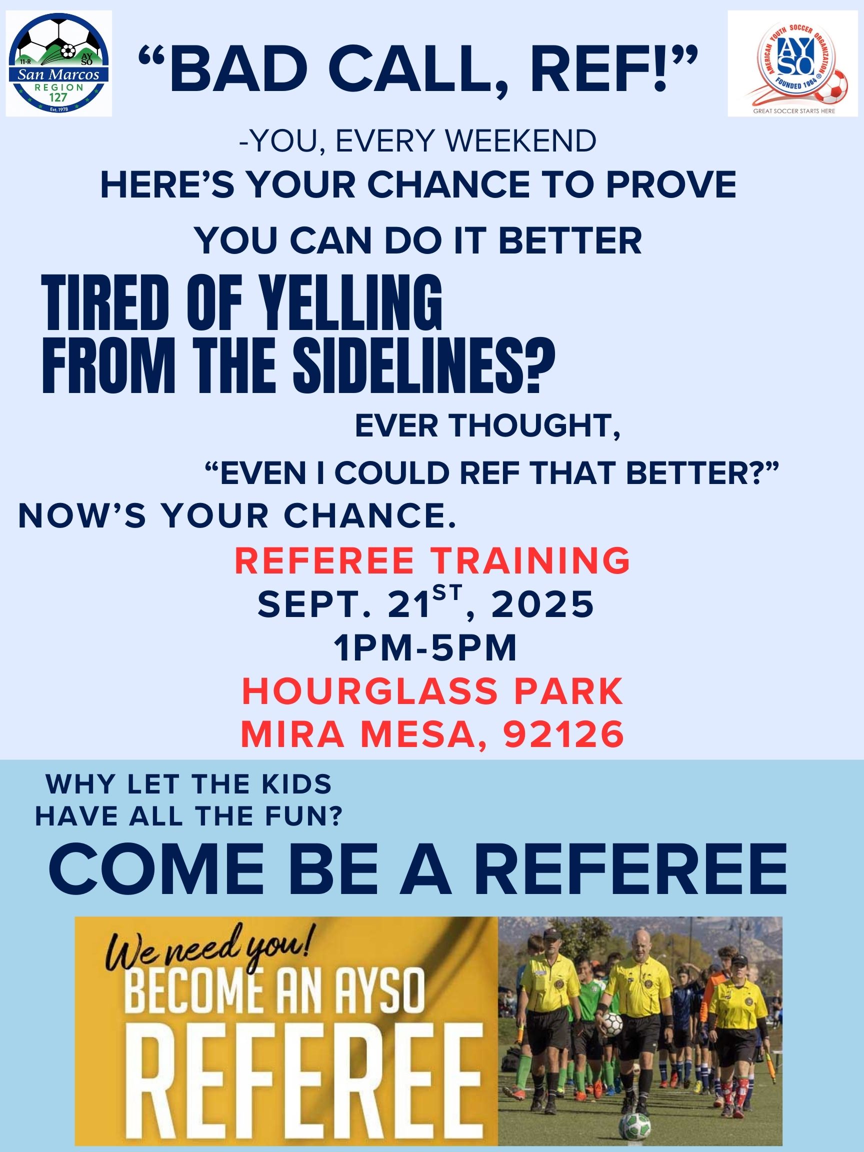 The AYSO Youth Referee Program is an opportunity for youths age 12 or above to participate as referees.